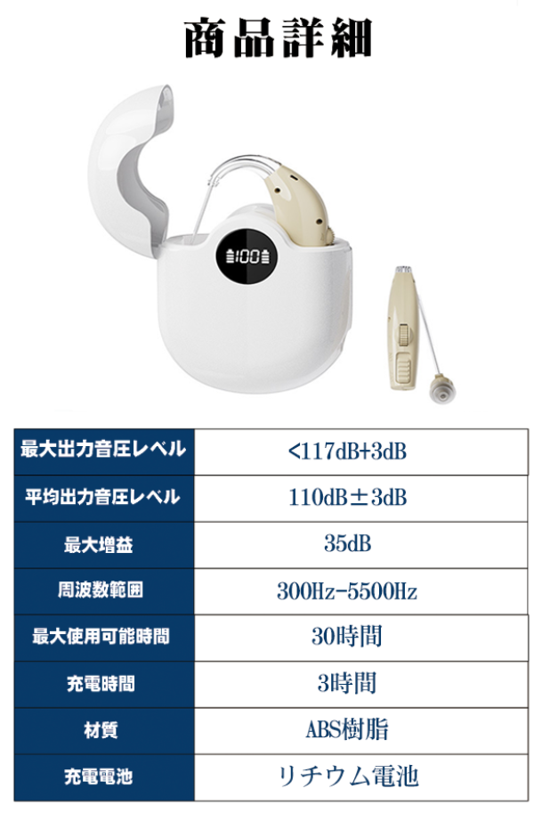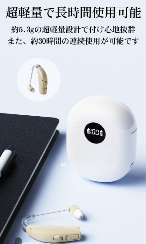 【超軽量で使いやすい】 軽量な設計により、片方の集音器はわずかの5.3gで、長時間着用しても不快感を最小限に抑えることができます。デジタルな数字で残る電量を表示され、電量状況をいつでも一目で確認できます。