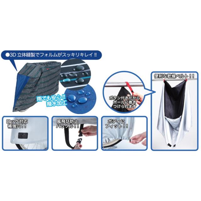 | 商品説明 | ・一般自転車24~27インチ、前幼児座席付き自転車20〜26インチに最適な自転車カバー ・後カゴ付き可。後幼児座席を付けた自転車には使用できない。 ・自転車のサイズ、形状によってかぶり込み具合は異なる。 3D立体縫製でフォルムがスッキリきれい。 ・カバーをしたまま盗難防止ロック対応、ロック通し穴付き。 ・風飛び防止バックル付き。ボディにフィット、裾絞り機能付き。 ・雨に濡れた後も乾燥ベルトで干せる ・異なるデザインを組み合わせたスタイリッシュな自転車カバー ・〈材質〉ポリエステル100%(PUコーティング)撥水(水をはじきやすい)加工 ・本製品は完全防水ではないこと。 ・水ははじきますが長時間のご使用や高水圧に対しては水を通してしまう場合あり。 ・自然光及び照明などにより、通常のご使用でも若干の変退色は避けられません。ご了承いただきたい。 ・約 縦:970mm 横:1950mm 幅:750mm |