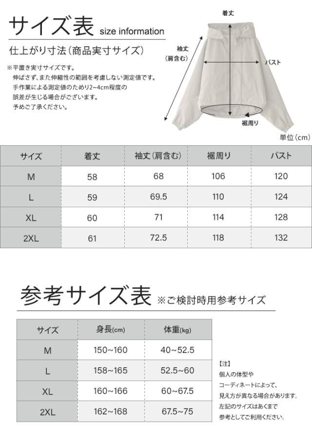 M = 着丈58、袖丈(肩含む)68、裾周り106、バスト120 L = 着丈59、袖丈(肩含む)69.5、裾周り110、バスト124 XL = 着丈60、袖丈(肩含む)71、裾周り114、バスト128 2XL = 着丈61、袖丈(肩含む)72.5、裾周り118、バスト132 ※平置き実寸サイズです。伸ばさず、伸縮性の範囲を考慮しない測定値です。手作業による測定値の為、2-4cmの誤差がある場合があります。予めご了承下さいませ。 |