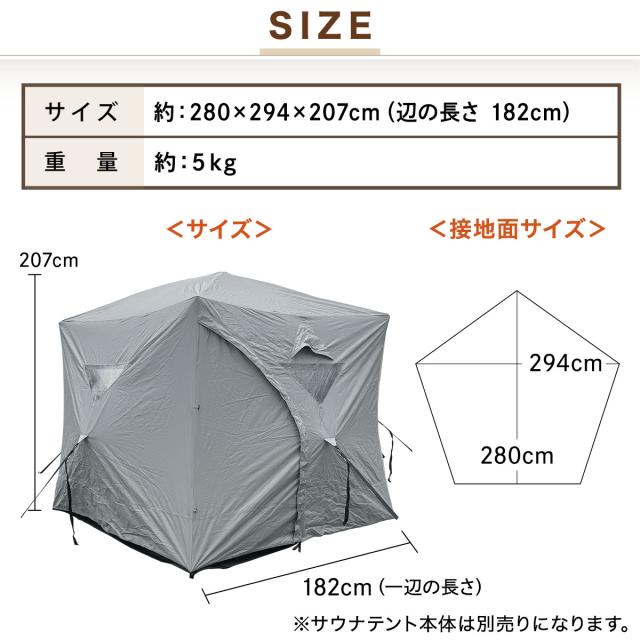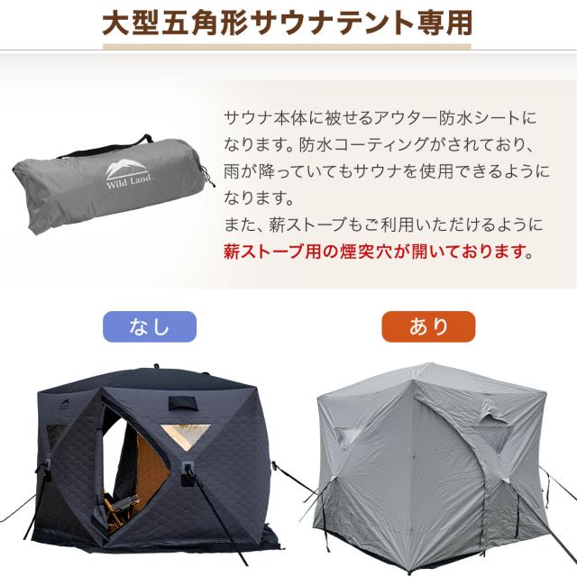 【大型五角形サウナテント専用】当店で販売している大型五角形サウナテントの外側にかけて使用し、雨避けができる防水シートになります。他のテントへのご利用は想定しておりませんので、予めご了承ください。