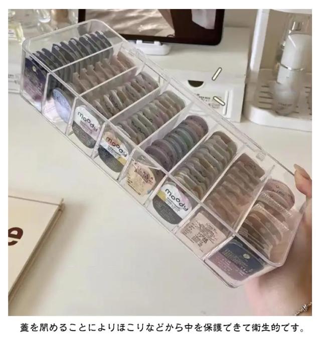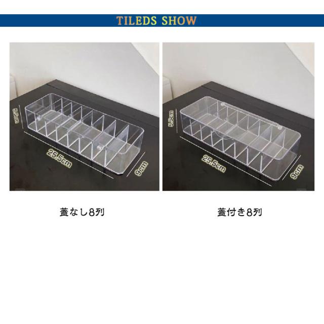 | 【コンタクト収納ケース】【蓋付き/蓋なし】 8列にわかれた仕切り付きの収納ケースです。 整理整頓におすすめのアイテムです。 1列につき平均的なサイズの使い捨てコンタクトが10個、計80個ほど収納できます。 左右や色、種類などを分別して保管が可能です♪ 蓋を閉めることによりほこりなどから中を保護できて衛生的です。 旅行などちょっとした携帯にも便利です。 様々な収納に: コンタクトレンズ、アクセサリー、文房具、化粧品、雑貨、アニメ・キャラクターアイドルグッズetc… | |