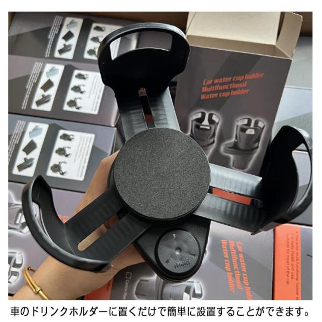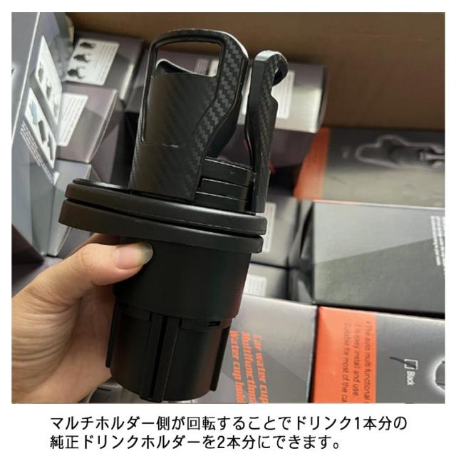 | ドリンクホルダー 車 2本 カップホルダー 上部ホルダーは幅の広さが調整可能!最大15cmまで広がります。コーヒーペットボトルから、紙パック、カップ麺までしっかりと固定されます マルチホルダー側が回転することでドリンク1本分の純正ドリンクホルダーを2本分にできます。 車のドリンクホルダーに置くだけで簡単に設置することができます。 ドリンクを置いた際のカタカタ音を軽減する底面クッション付きです。 | |