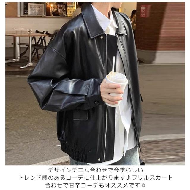 | 高見え間違いなしのレザー素材のブルゾンです。 大き目のポケットやゆったりとしたシルエットがポイント。 インナーには、カットソーをはじめ、シャツやニット、スウェットやパーカーなどと合わせるのがおすすめ。 インナーを調節することで春先までロングシーズン着用可能。秋から春先まで活躍するおすすめのアウターです。 デザインデニム合わせで今季らしいトレンド感のあるコーデに仕上がります♪フリルスカート合わせで甘辛コーデもオススメです◎ | |