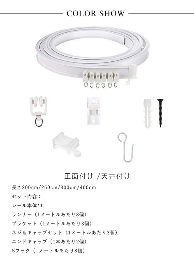 | サイズについての説明 | F 長さ200cm/250cm/300cm/400cm セット内容: レール本体*1 ランナー(1メートルあたり8個) ブラケット(1メートルあたり3個) ネジ&キャップセット(1メートルあたり3個) エンドキャップ(1本あたり2個) Sフック(1メートルあたり8個) |