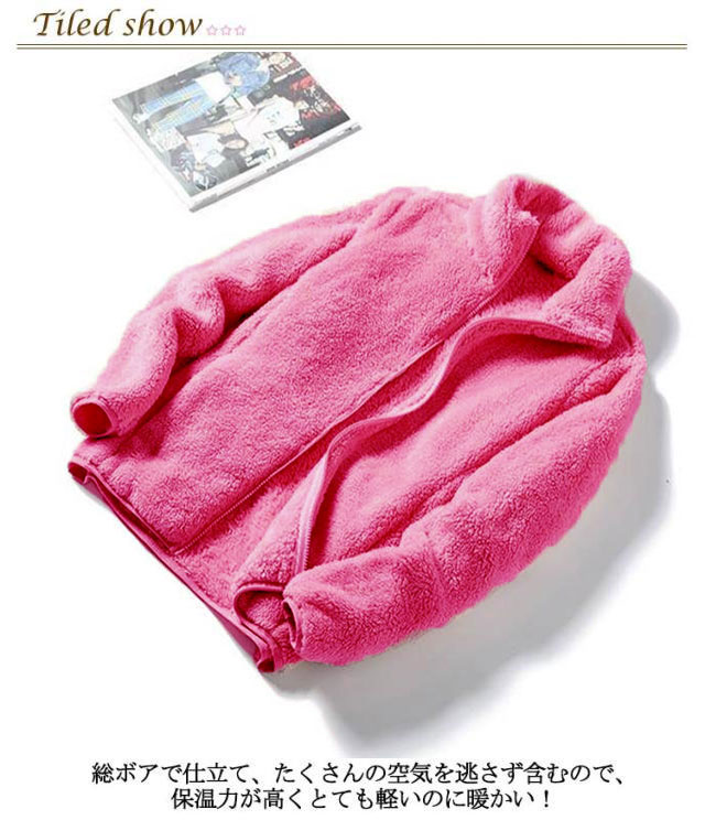 | 軽くてふわふわの肌ざわりがとても柔らかいフリースジャケット登場。 総ボアで仕立て、たくさんの空気を逃さず含むので、保温力が高くとても軽いのに暖かい! マフラーがいらず、首元もあたたくなるスタンドカラーを採用しました。 左右部分にはポケットも付いています。 秋口の肌寒い季節にはもちろん、冬のアウターにインしてボアをちらりと覗かせても。 もちろん部屋着としてもいいです! | |