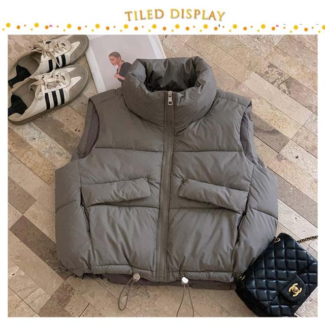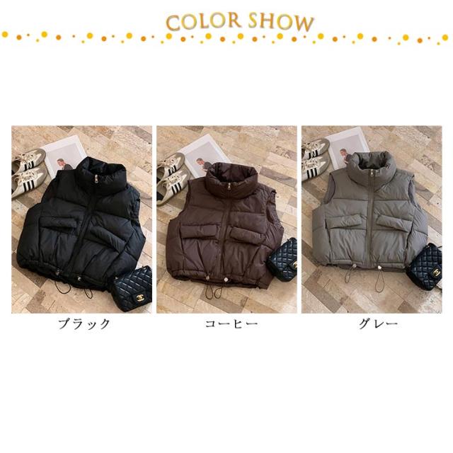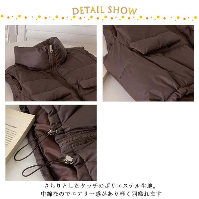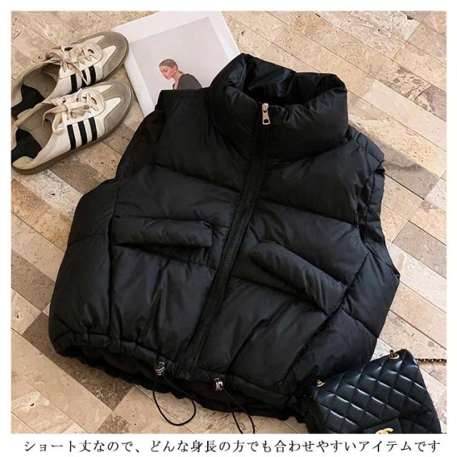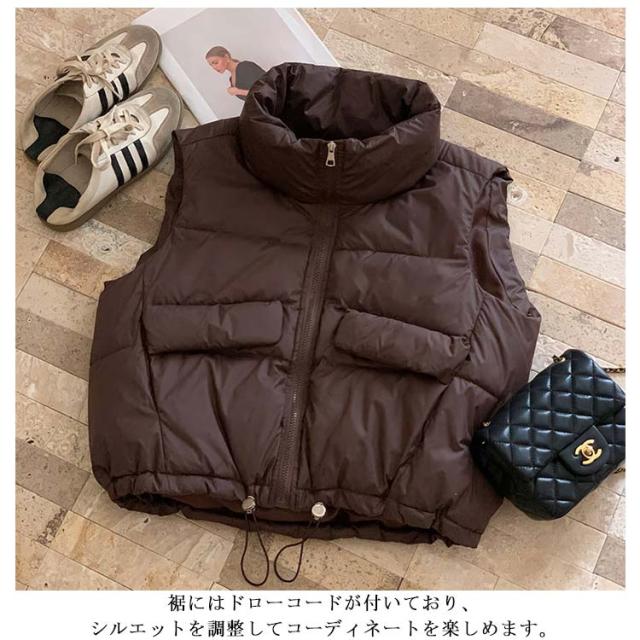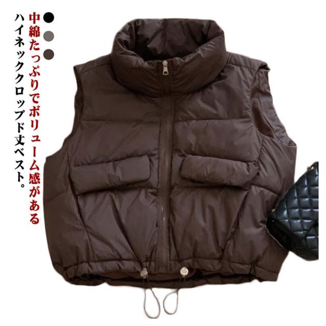 可愛い 中綿ベスト 冬 ハイネック レディース ショート丈 ダウンベスト 軽量 防寒 あったか ジップアップ エコダウンジャケット コンパクト 秋 ノースリーブ アウター クロップド丈 裾ドローコード ボリューム 大人 エコダウンベスト カジュアル おしゃれ