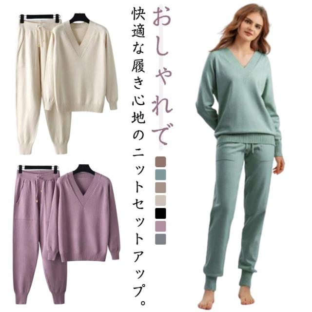 ニット セットアップ 秋冬 レディース ニットアップ ジョガーパンツ セーター 長袖 ニットパンツ Vネック ニットセーター ゆったり 部屋着 楽チン 秋 冬 30代 40代 送料無料