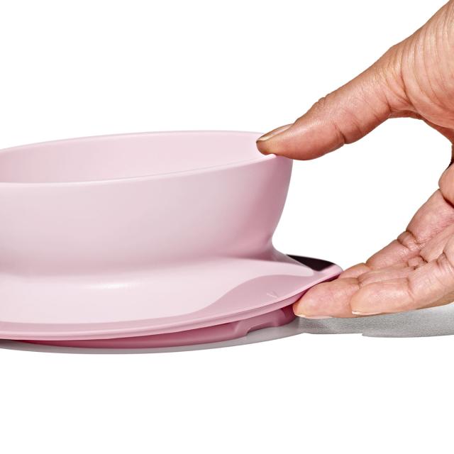 底面についた吸盤がテーブルやトレイに密着して、ズレずに食事ができるボウルです。フチに高さがあるので、お子様がスプーンやフォークで食べ物をすくいやすく、楽しくお食事ができます。
