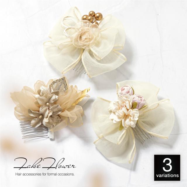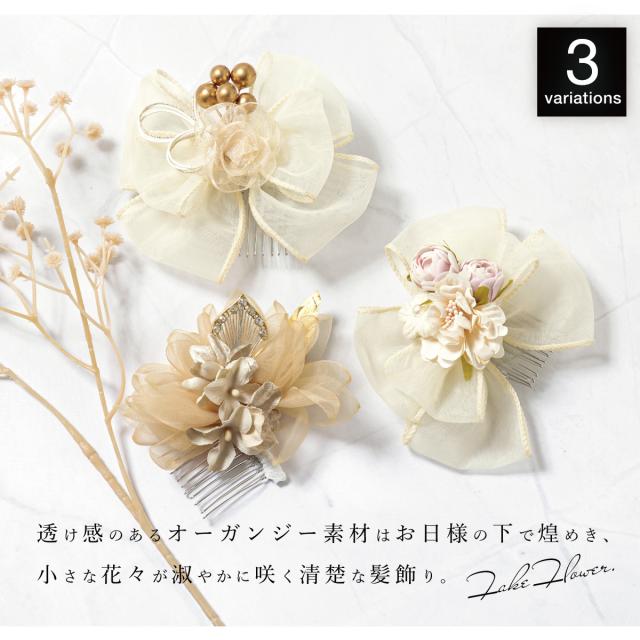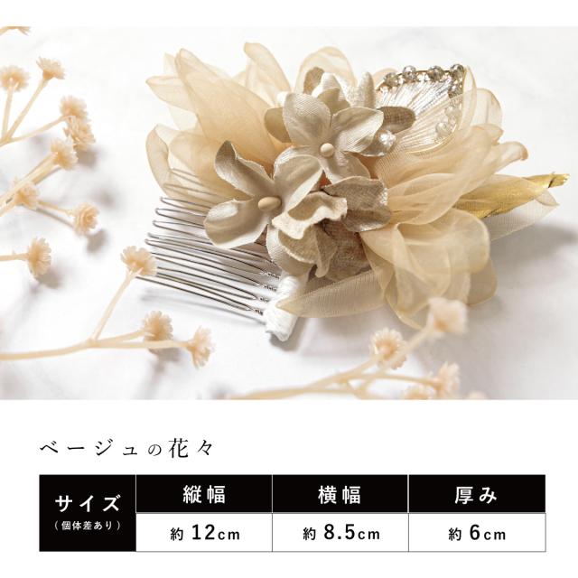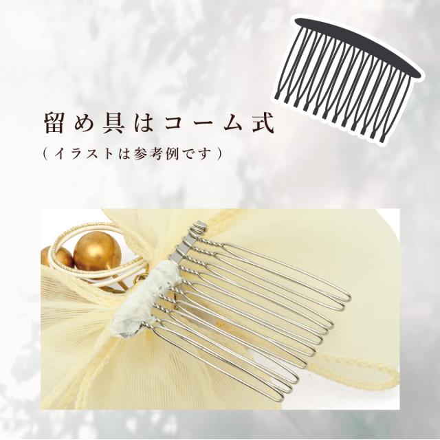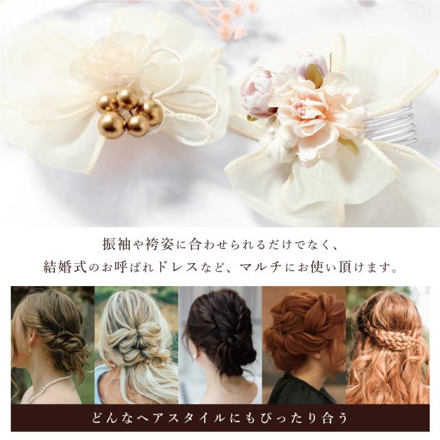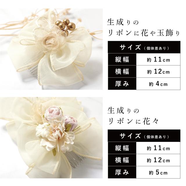 髪飾り レディース 成人式 卒業式 袴 振袖 ベージュ クリーム オーガンジー リボン 花 玉飾り コーム式 小ぶり ヘアアクセサリー
