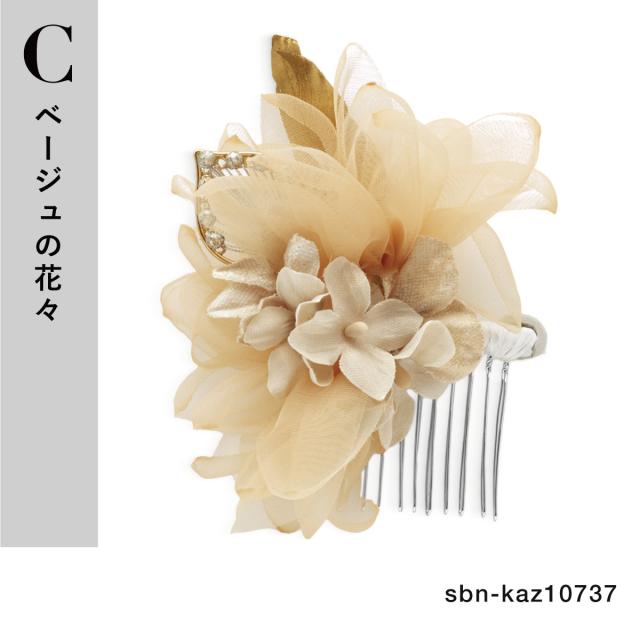 透け感のあるオーガンジーの花びらが美しい花やリボンに小花やリーフ、玉飾りが添えられた大人可愛いデザインです。
