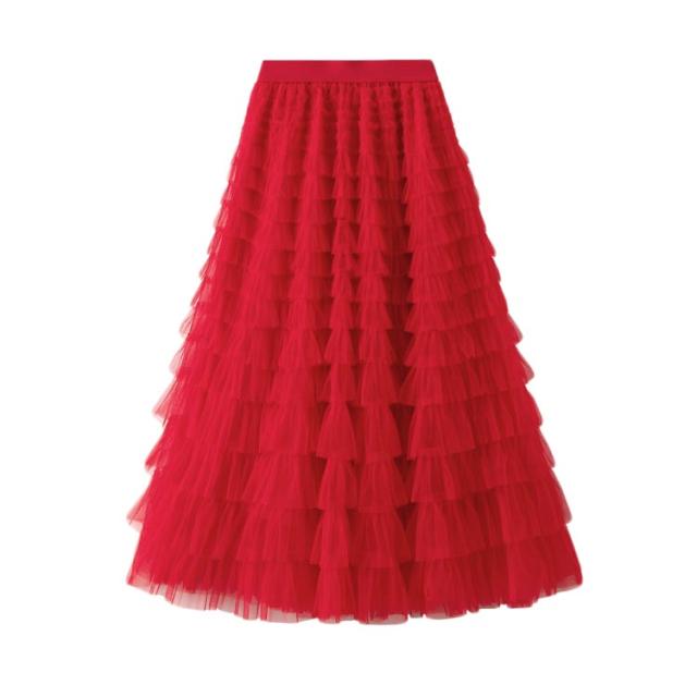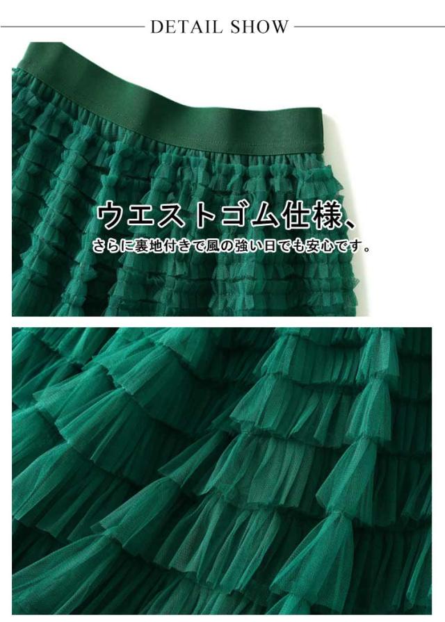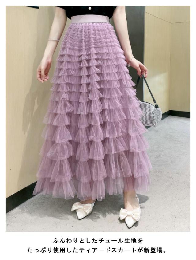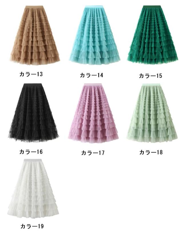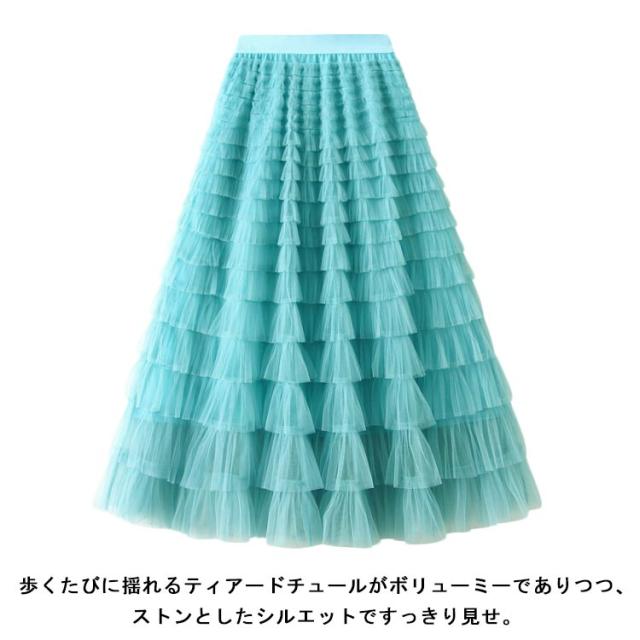 女性 スタイルアップ ボリューム スカート ロングスカート チュール レディース ティアードスカート ボトム チュール フリル レイヤード ティアード スカート ロング 華やか ドレッシー 存在感 カラフル全19色展開 シアー 透け感 ティアード
