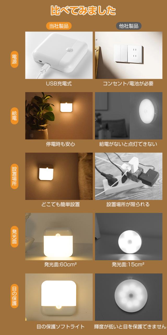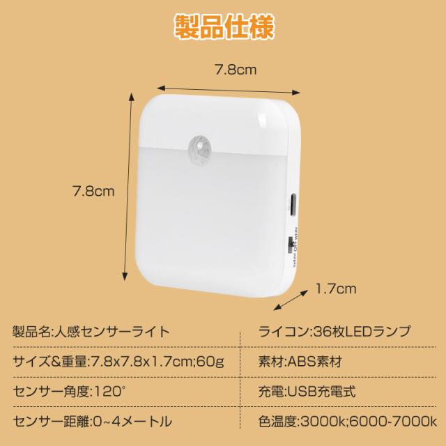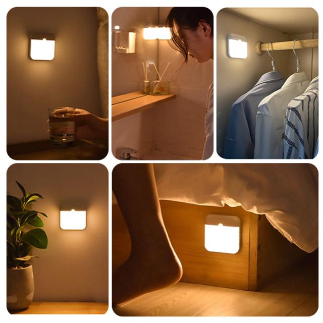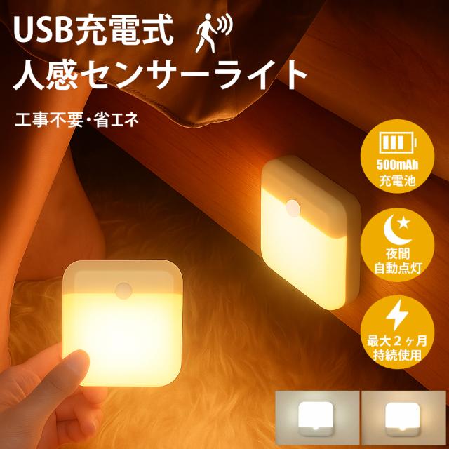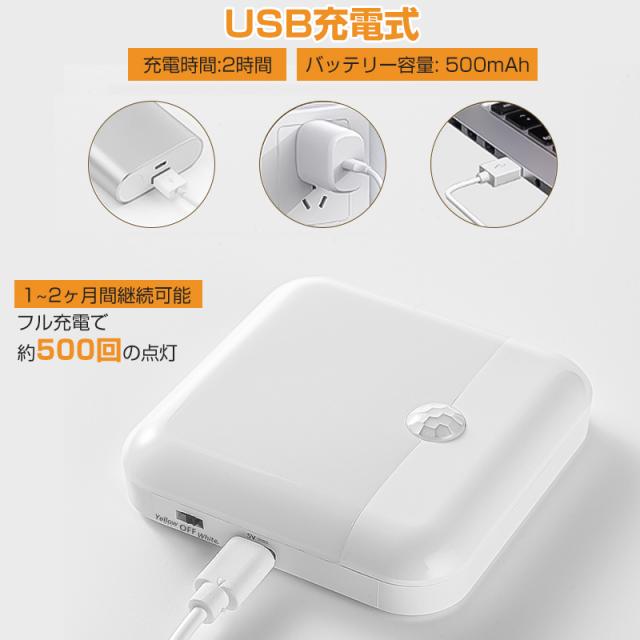 【激安1点600円&3点セット購入で】人感センサーライト USB充電式 ナイトライト 足元灯 高感度 人感検知 自動点灯 自動消灯 省エネ 簡単取り付け 玄関 廊下 トイレ キッチン 室内 明るい おしゃれ
