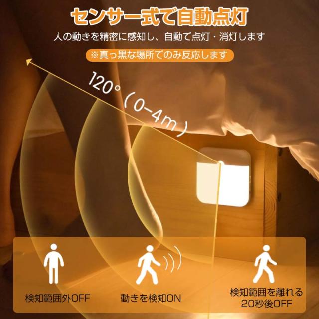 暗い場所で人や動物の動きを感知すると自動で点灯し、感知範囲を離れてから約20秒後に自動で消灯します。感知範囲は120°、約4メートル以内で、AUTOセンサーモードは暗い環境でのみ作動します。省エネで経済的、環境にも優しい仕様です。