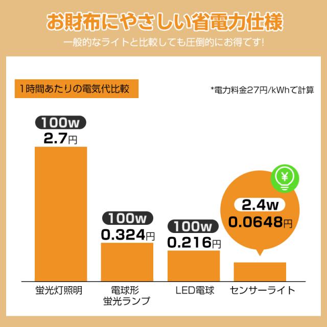 LEDライトはエネルギー消費が少なく、白熱ランプの1/10、蛍光ランプの1/4程度で、理論上10万時間以上の寿命を持っています。センサーモードでは必要のないときに無駄な電力消費を抑えられる設計です。