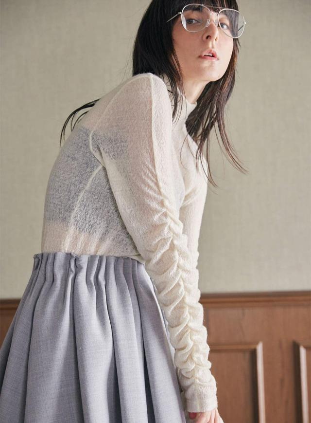 サイドシャーリングが女性らしいラインを引き立てるハイネックトップス。