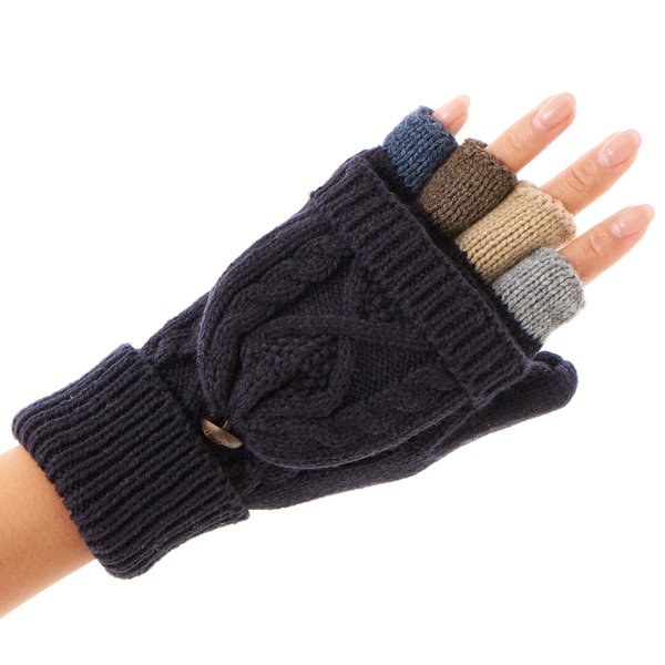おしゃれなケーブル編みフード付きニット手袋。人差し指から小指までの指先が出るのでスマホなどの操作が可能です。フードを被せばミトン手袋に早変わり。