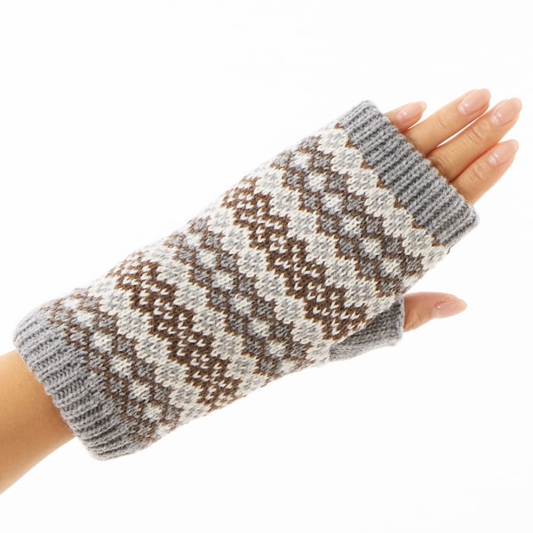 おしゃれなフェアアイル柄指無しニット手袋。指先が出るのでスマホなどの操作が可能です。裏地付きでとても暖かです。