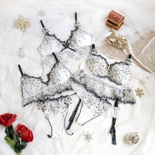 ストラップにはペアのアップリケを、中央には雪の結晶のチャームをプラスして、より一層クリスマスらしい装いに。カップ下は幅広の刺しゅうレースで切り替え、ふんわり広がるチュールとのメリハリで、特別感あふれるスタイルをお楽しみいただけます。