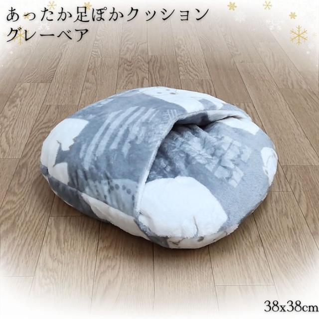 あったか足ぽかクッション かわいいベア柄 グレー色 38x38cm 冷える足元を暖かく 冬用 フランネル ふっくらふかふか