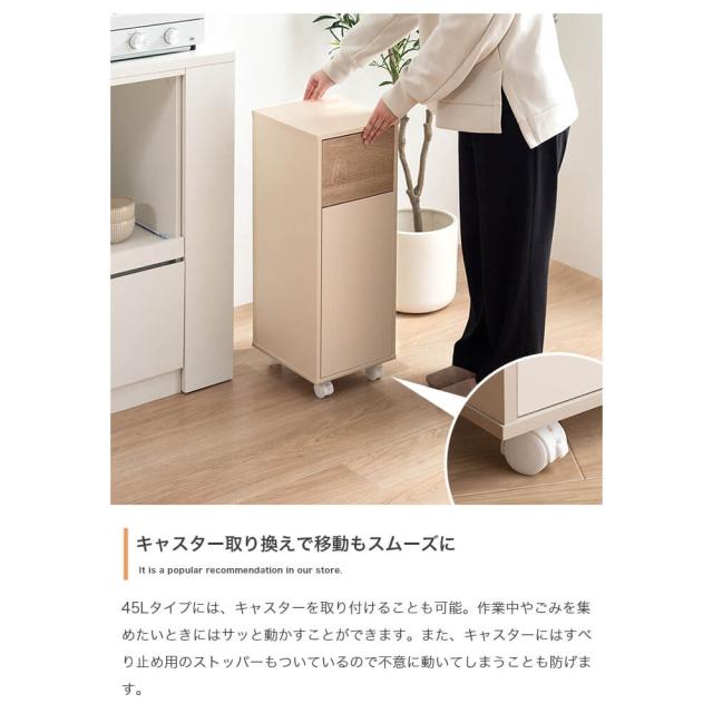 サイズは、幅26cm × 奥行30cm × 高さ64.8cm(キャスター使用時:70cm)で、容量は45L。