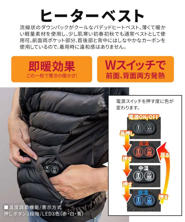 ・薄くて暖かい軽量素材を使用し、少し肌寒い初春初秋でも通常ベストとして使用可。