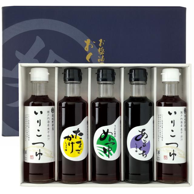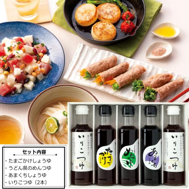いまや定番ともいえるTKG(卵かけご飯)専用のだし醤油をはじめ、うどん県ならではのめんつゆ・瀬戸内の煮干しを使ったいりこつゆなど、讃岐の味を存分にいかしただし醤油のセットです。