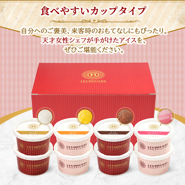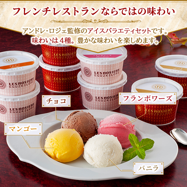 商品名 銀座京橋 レ ロジェ エギュスキロール 銀座アイスバラエティ8個 AH-RG8 容量 バニラ 、チョコ、マンゴー、フランボワーズ各74mL×各2個(計8個) 原材料名 【バニラ】クリーム(国内製造)、砂糖、脱脂粉乳、加糖卵黄、水あめ、バニラビーンズ/乳化剤、安定剤(増粘多糖類)、香料、(一部に卵・乳成分を含む)
