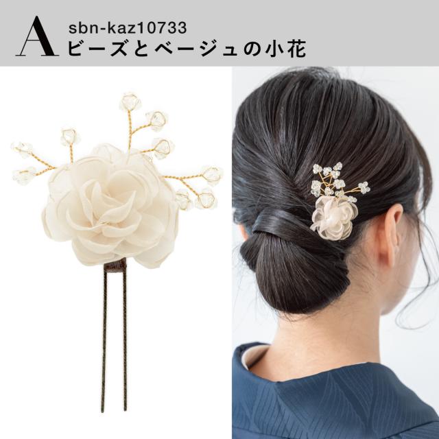 髪飾り レディース 成人式 卒業式 袴 振袖 ベージュ 白 金 花 オーガンジー ビーズ Uピン式 小ぶり ヘアアクセサリー メール便対応 送料無料