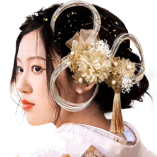 ・成人式 髪飾り 花 水引きセット花飾りをついているので、華やかさをプラスしてくれます。セットした髪に 水引きと金箔を貼り付けて高級感があり素敵なお品でした。ハレの日にはこんな豪華な髪飾りで着物姿もよりいっそう華やかに美しい和装髪飾りです。