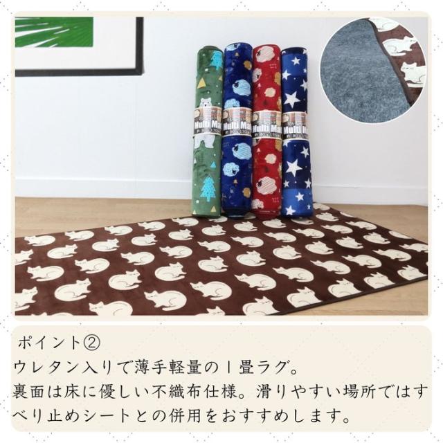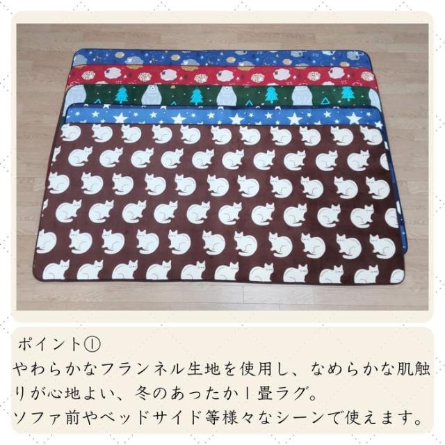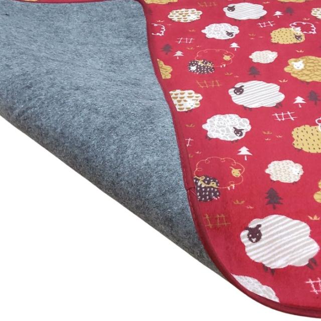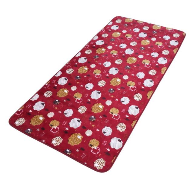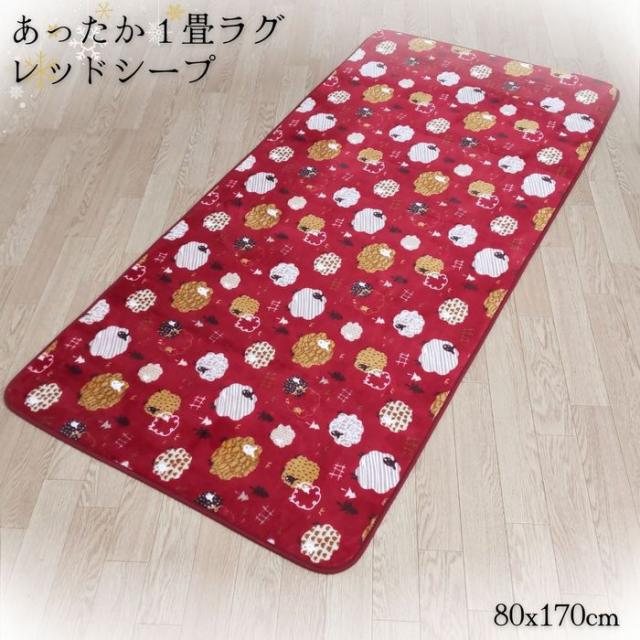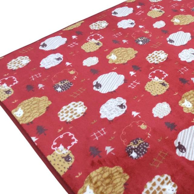 あったか1畳ラグ かわいい羊柄 レッド色 80x170cm 軽量薄手 冬用 フランネル ウレタン入り ソファ前やベッドサイドに