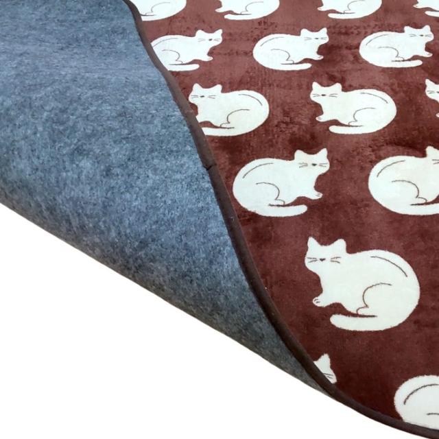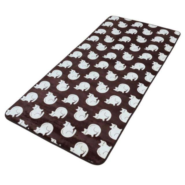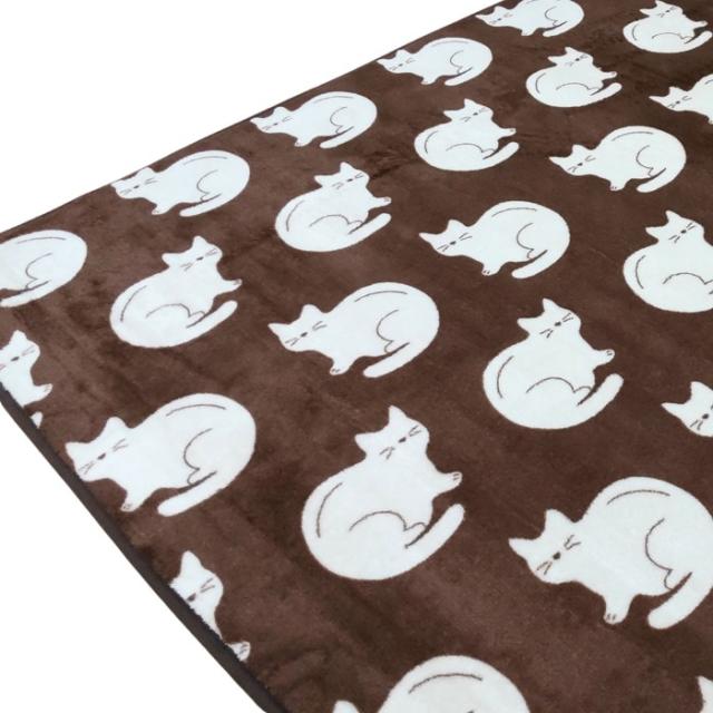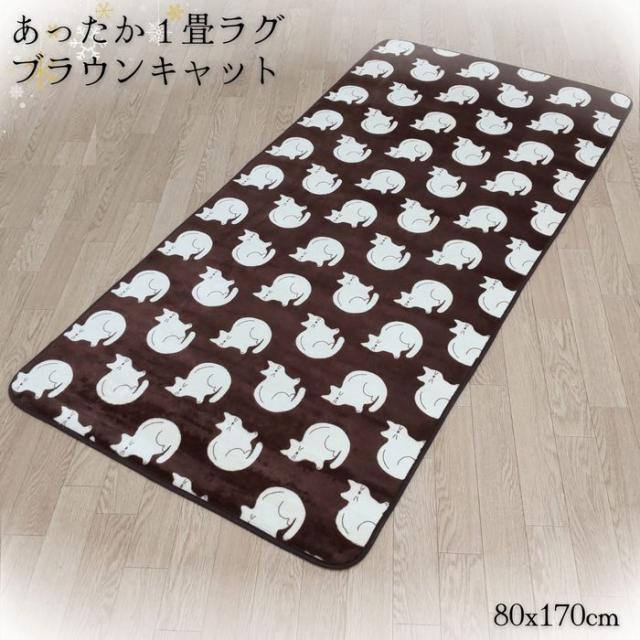 あったか1畳ラグ かわいいネコ柄 ブラウン色 80x170cm 軽量薄手 冬用 フランネル ウレタン入り ソファ前やベッドサイドに