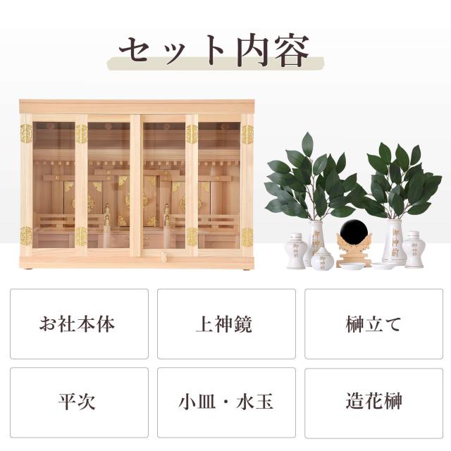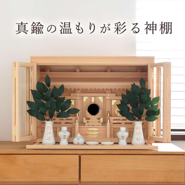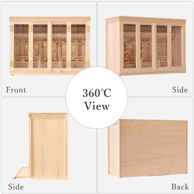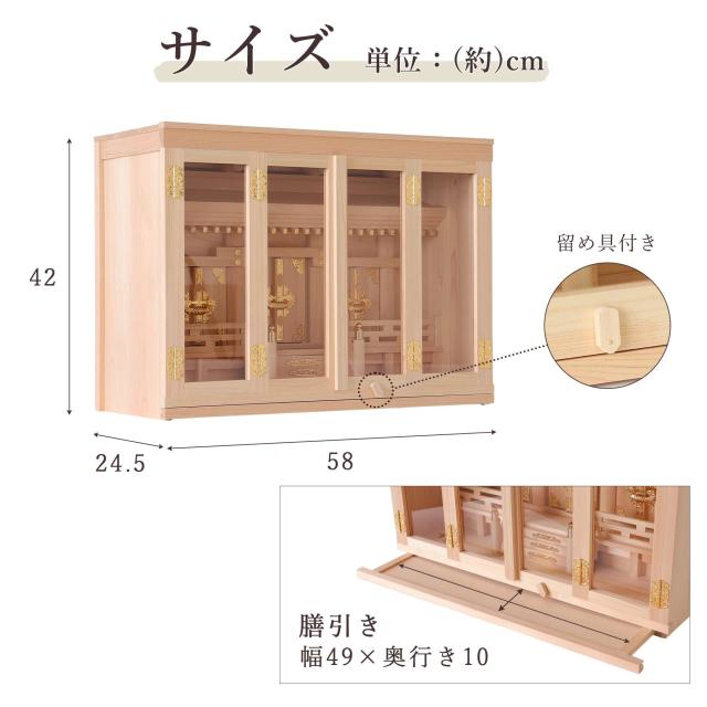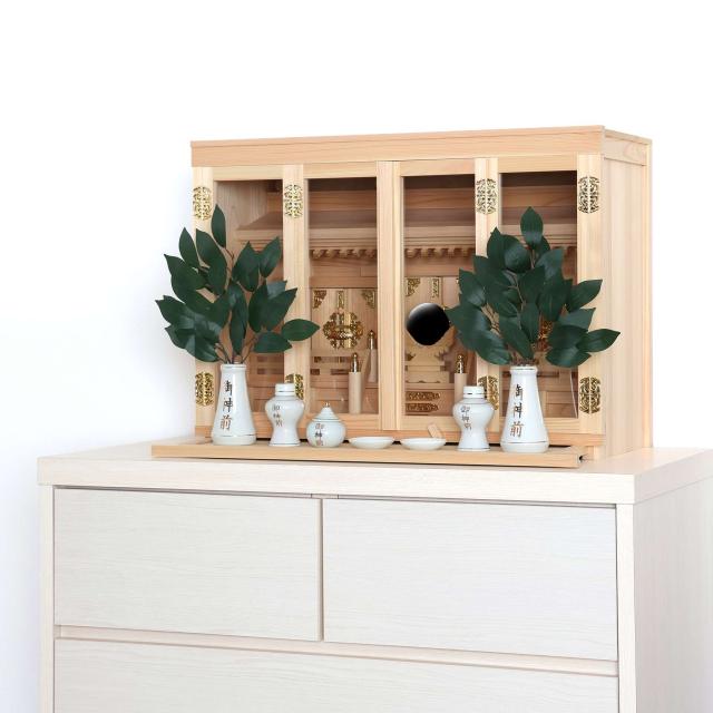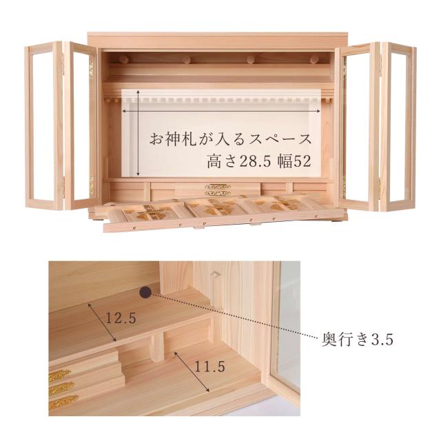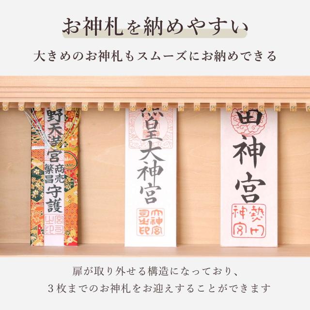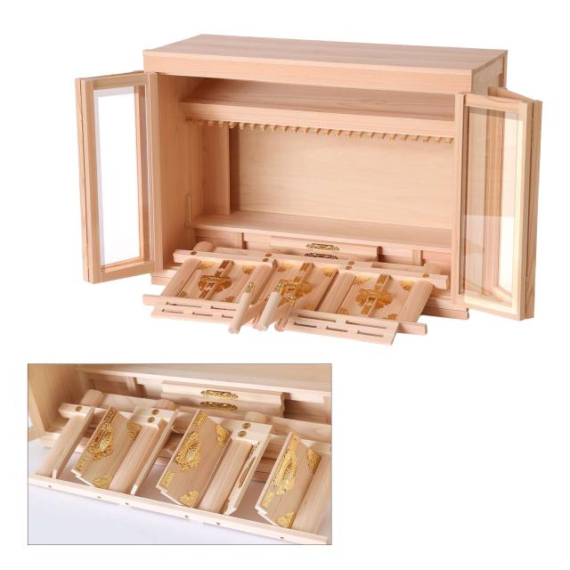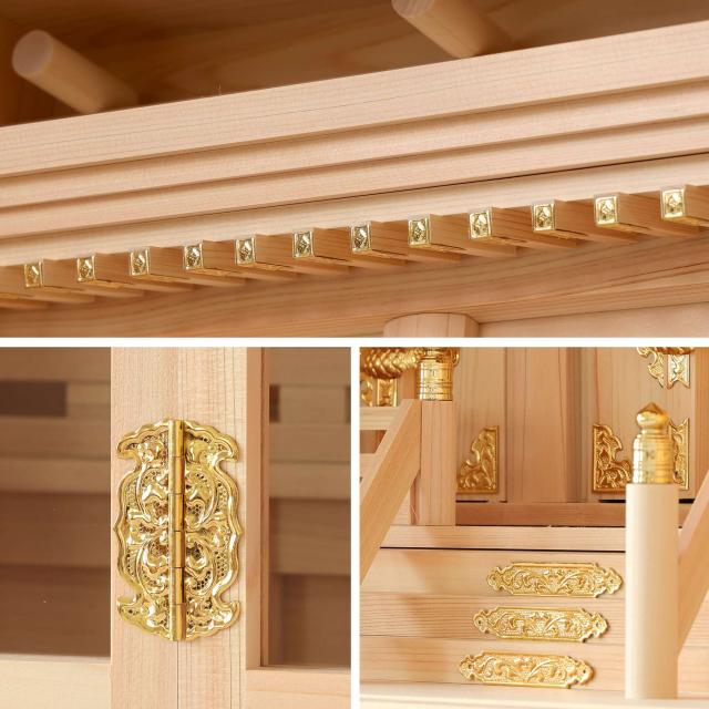 神棚本体には香り豊かで耐久性の高い「東濃桧(ひのき)」を使用しており、木目の美しさと清らかな香りが祈りの場を一層引き立てます。 扉には透明なガラスが使用され、埃や汚れを防ぎつつ、内部の神具や装飾を美しく引き立てます。 また、膳引きが付いているため、お供え物の整理や配置が簡単に行える設計となっています。