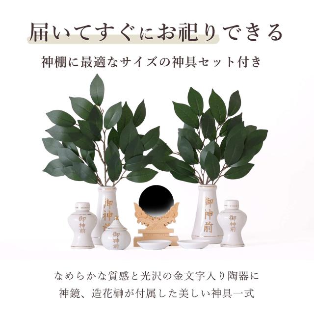 届いてすぐにお祀りを始められるよう、国産の金文字入りせともの陶器を含む神具一式が付属しています。