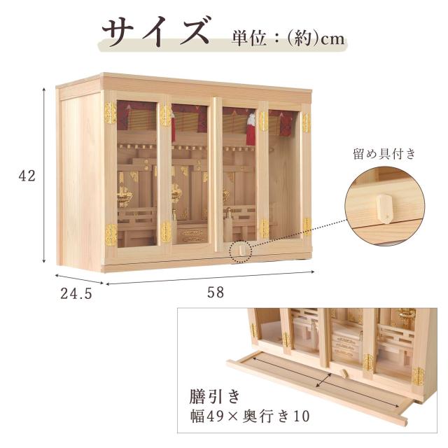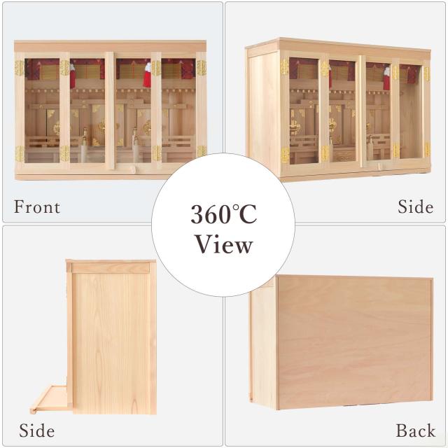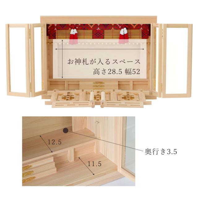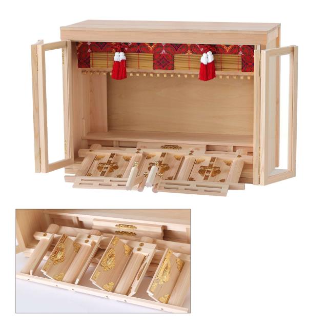 扉には透明なガラスが使用され、埃や汚れを防ぎつつ、内部の神具や装飾を美しく引き立てます。 膳引きが付いているため、お供え物の整理や配置が簡単に行える設計となっています。 3枚の扉が手前に外せる構造になっているため、お札の出し入れが簡単です。