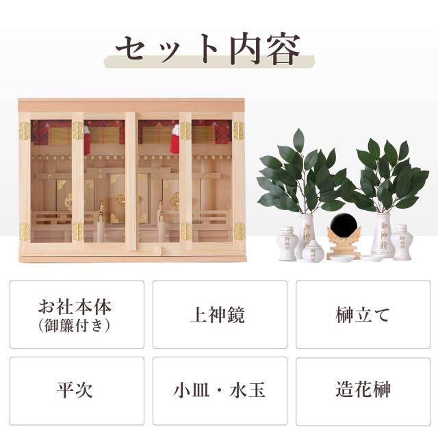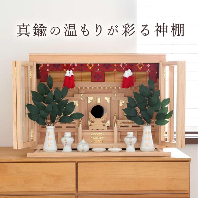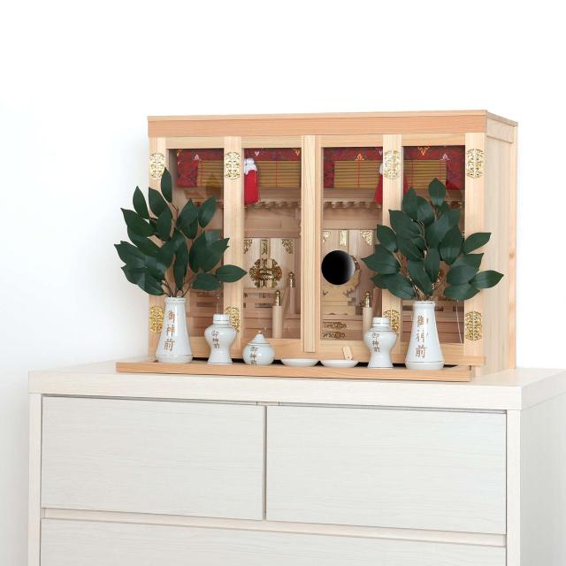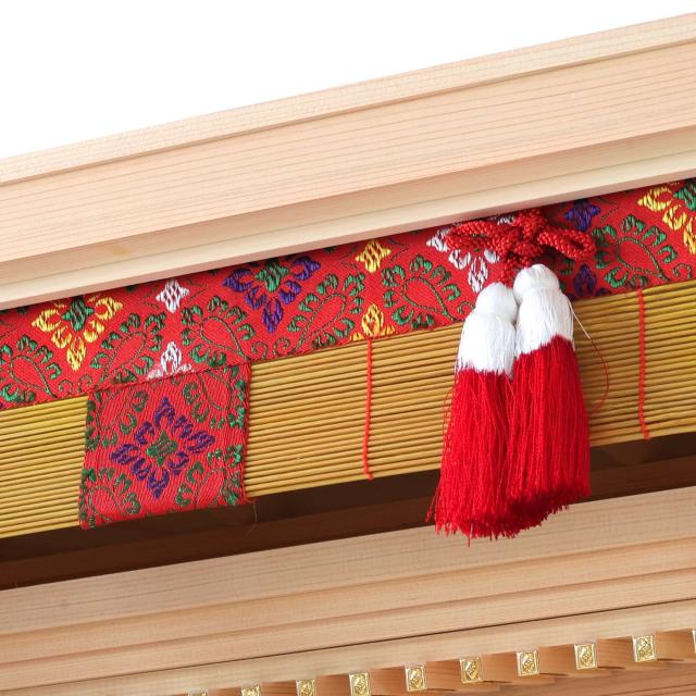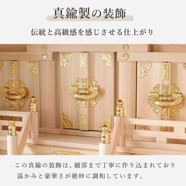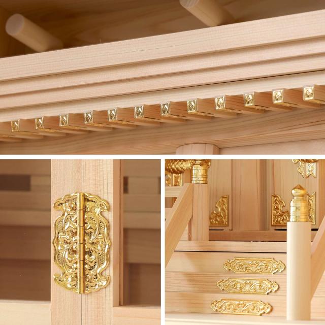 神棚本体には香り豊かで耐久性の高い「東濃桧(ひのき)」を使用しており、木目の美しさと清らかな香りが祈りの場を一層引き立てます。