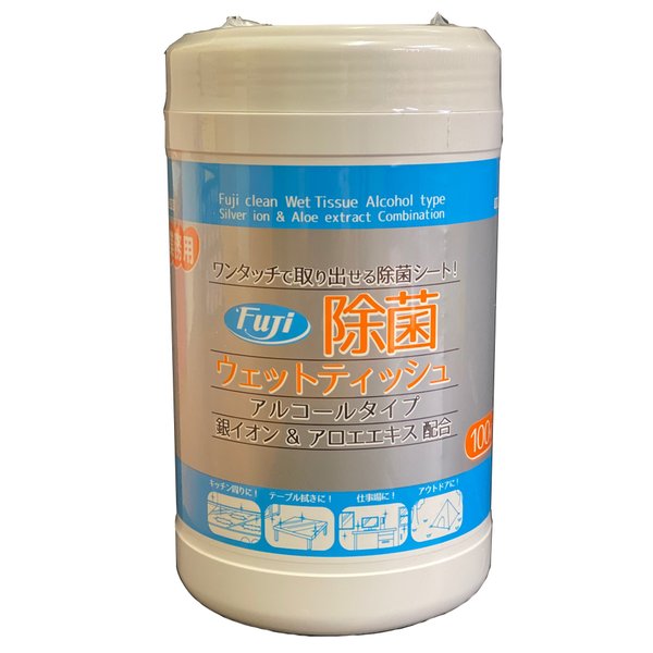 「フジ 除菌ウェットティッシュ」は、ワンタッチで取り出せる除菌シートです。アルコールタイプ。銀イオン&アロエエキス配合。