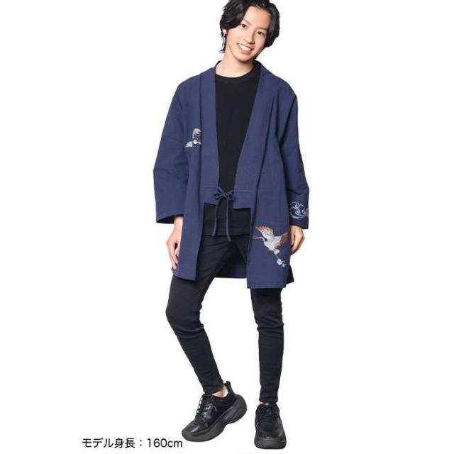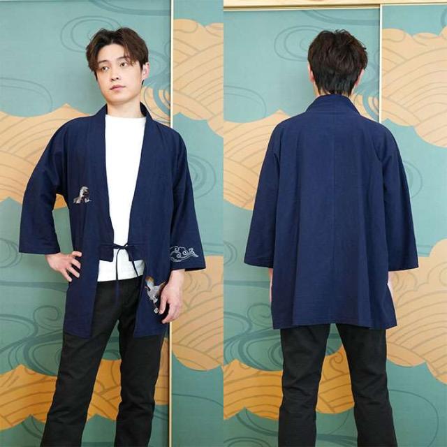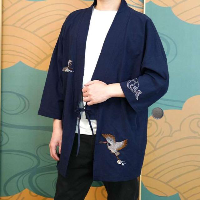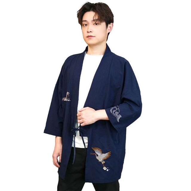 胸元と裾に鶴、袖口には雲の刺繍が入った本格的な羽織です。しっかりとした生地で着心地も抜群。男性にも女性にも着用いただけます。