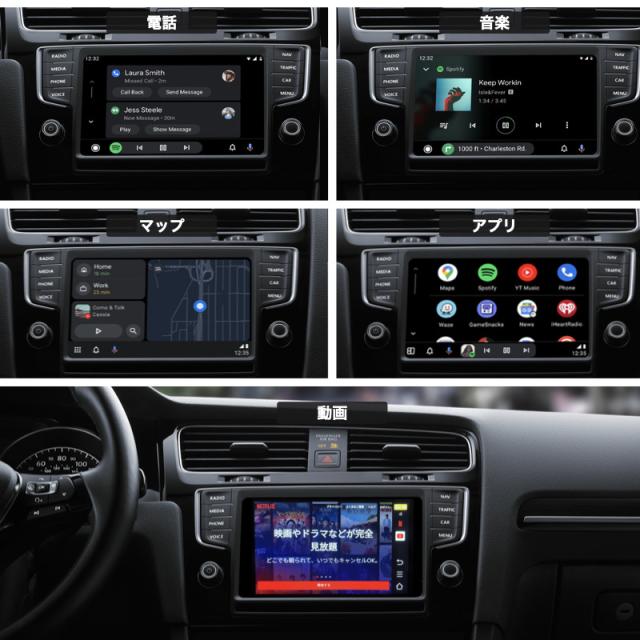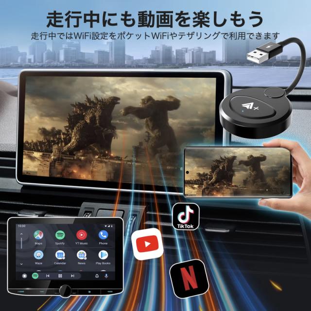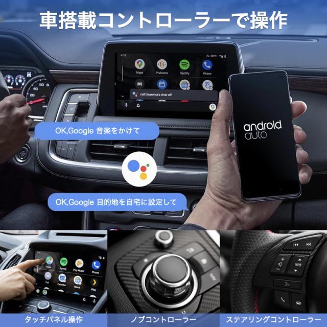 【プラグ&プレイ】接続作業が簡単で、他のドライブやアプリなどは不要です。1、アダプタでナビやディスプレイオーディオに接続します。2、スマホ側のBTとWi-Fiをオンにして、1度設定すれば2回目以降からエンジンを切っても次回からそのまま使えるようになります。【動画視聴・純正操作続行】YouTubeなどの動画が見られる!Android Autoが付いているナビに接続したら、Youtube、Netflix、TikTokが見られます。ノブコントロール、ステアリングコントロール、音声コマンド、ハンドルコントロール、タッチスクリーンなど純正の機能も使えます。【スマートで安全な運転アシスタント】このAndroid Autoアダプターは、iPhoneのAPPを車のディスプレイに同期でき、画面タッチ、ボタン、ノブなどの元の車の制御方法とも完全に互換性があります。音声コントロール、Siri、オンライン音楽、GPS ナビゲーション アプリ、音楽アプリ、通話、メッセージの使用を含む、すべてのオリジナルの Android Auto機能をワイヤレスで楽しむことができます。