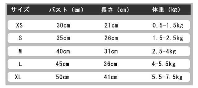 XL:バスト: 50cm・長さ:41cm・体重:5.5kg−7.5kg