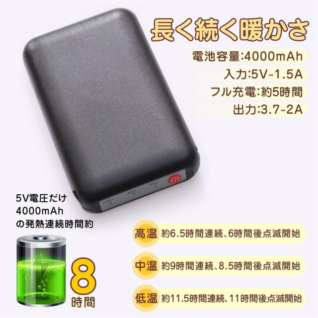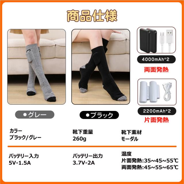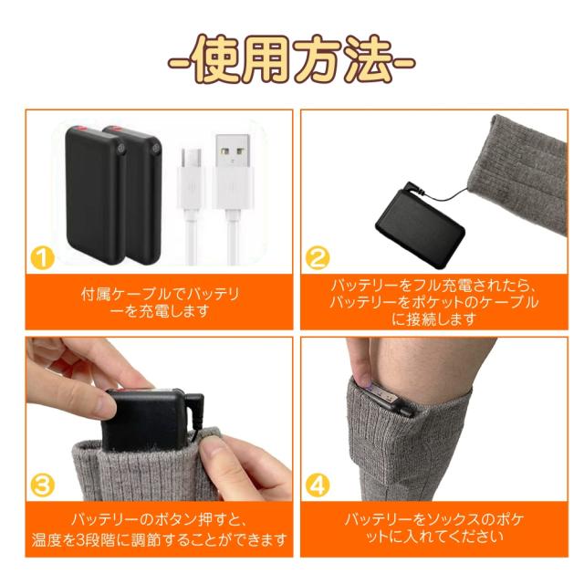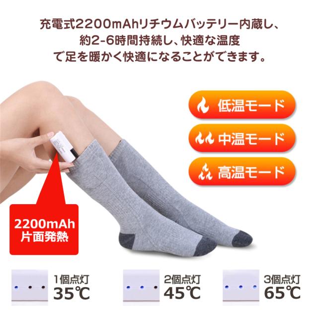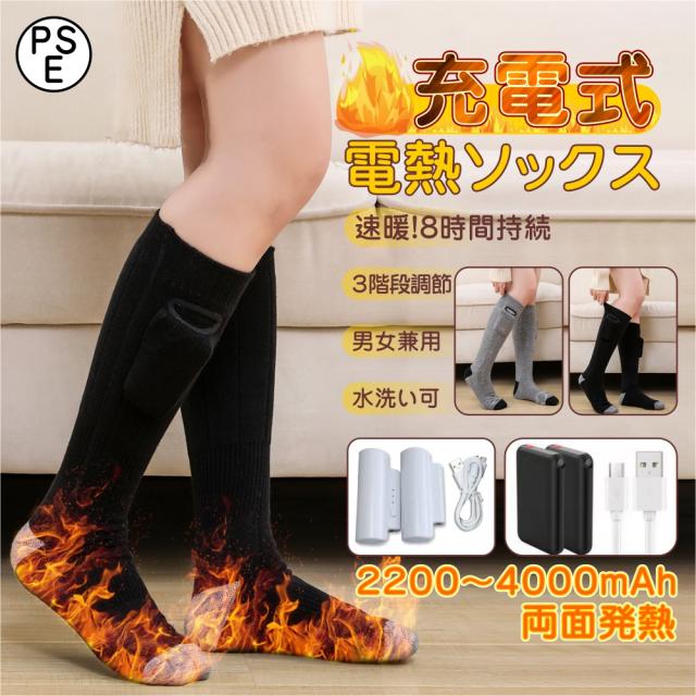 電熱ソックスには、充電式3.4V 2200mAhのリチウムイオンバッテリー二つが含まれています。電熱 ソックスは、低温設定で最大約8時間、中温設定で5-5.5時間、高温設定で約4-4.5時間持続します。現場仕事が寒すぎて辛くて、体調を悪い方、暖房器具の電気代をもう少し安くしたい方、釣り、登山などの冬のアウトドアスポーツが好きな方にお勧めします。