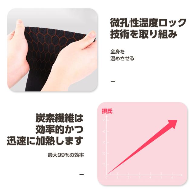 靴下の前端部には二つの赤外線炭素繊維電熱ヒーターが内蔵されて、5秒でヒーターの周りが暖かくなり、電熱ヒーターで直接に暖めるので暖房効果が高いです。底冷えから足の前部全体を暖めることで、新陳代謝を維持と血液の循環を刺激でき、全身の冷え予防になります。