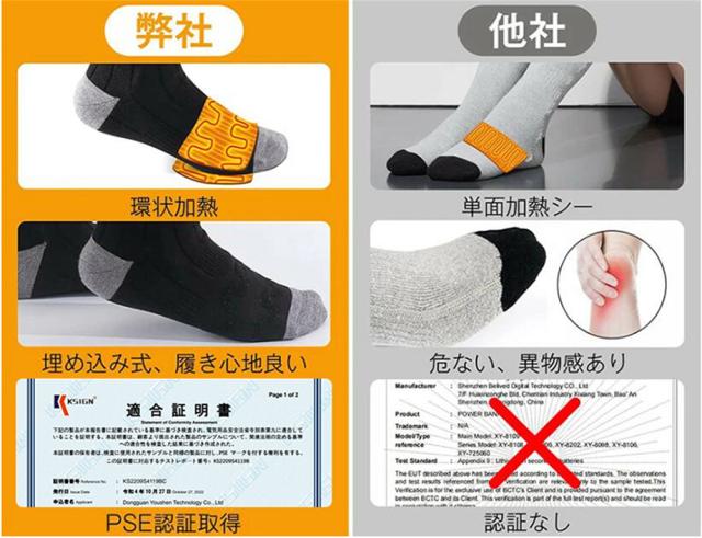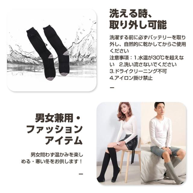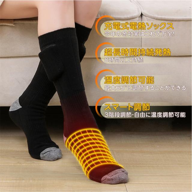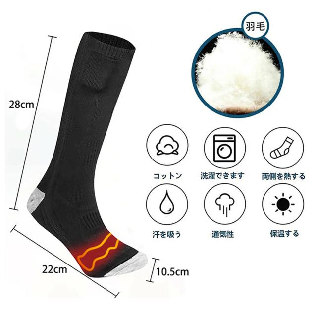 [高品質素材&水洗い可能]靴下は83%棉、10%ポリエステルと7%ポリウレタンを採用し、優れた防寒保温性能を実現しながら、伸縮性、通気性、速乾性、吸収性を備えます。伸縮性が優れたパイル編みなので男女兼用です。耐久性が抜群、履き心地が快適な加熱靴下です。当電熱ソックスを水で洗えますが、強力に揉まないでください。そして、商品を長時間使えるために、洗濯機で洗わないでください。