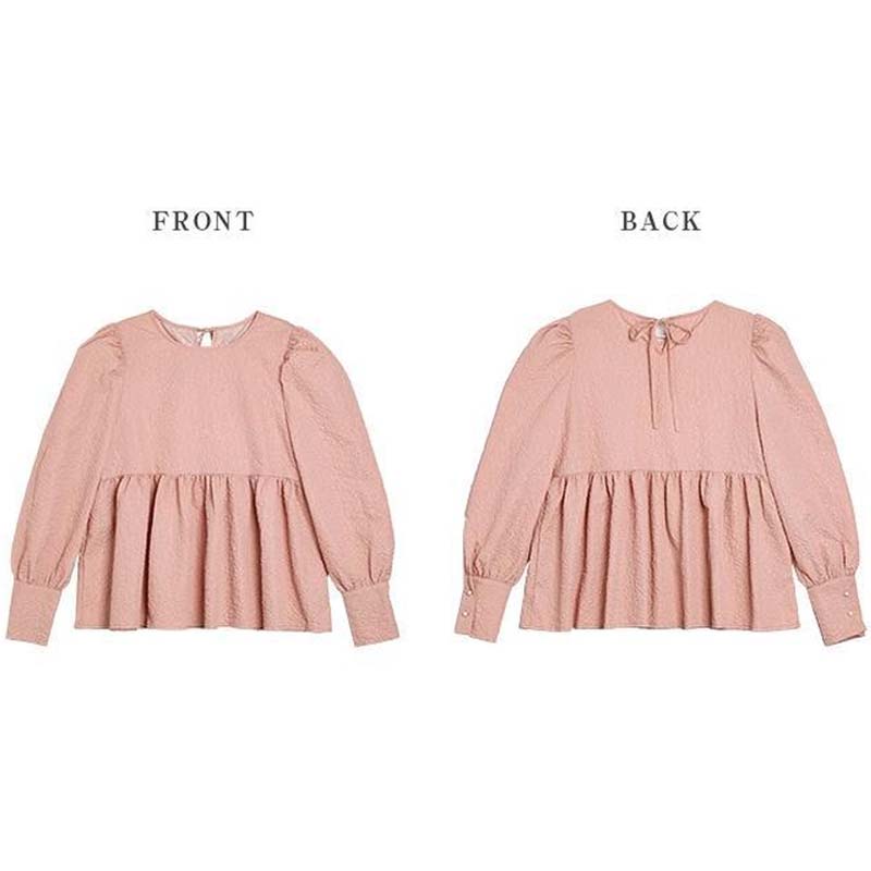 ペプラムトップス 後ろリボン ペプラム エンボス加工 長袖 韓国 上品