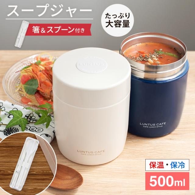 いつでも、どこでも、美味しく温かいスープが飲めるスープジャー。ステンレス真空断熱構造、保温・保冷で、中身の温度を保ちます。朝に熱々のスープを入れれば、お昼ごろには食べごろの温度に。夏の暑い時期なら、冷製スープにも使えます。リゾット、ピラフなどのご飯ものにも最適。たっぷり食べたい方に最適サイズ500mlです。箸スプーンのコンビセット付き。スープボトル SR500容量 : 500mlサイズ : 直径10.2×高さ13.4cm材質 : 本体=ステンレス鋼(アクリル樹脂塗装) フタ=ポリプロピレン(中材:発砲PP断熱材) フタカバー=ポリプロピレン フタパッキン・エア弁=シリコーンゴムコンビセットサイズ : 幅19.5×奥行5.3×高さ2.7cm材質 : 本体・スプーン=ABS樹脂、フタ・箸=AS樹脂、ホルダー=シリコーンゴム