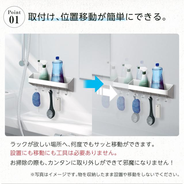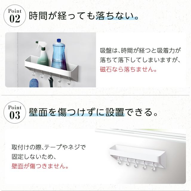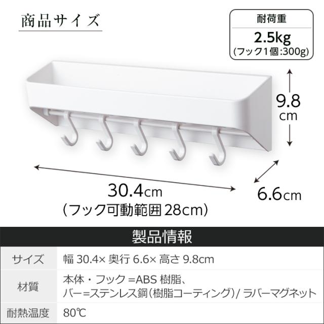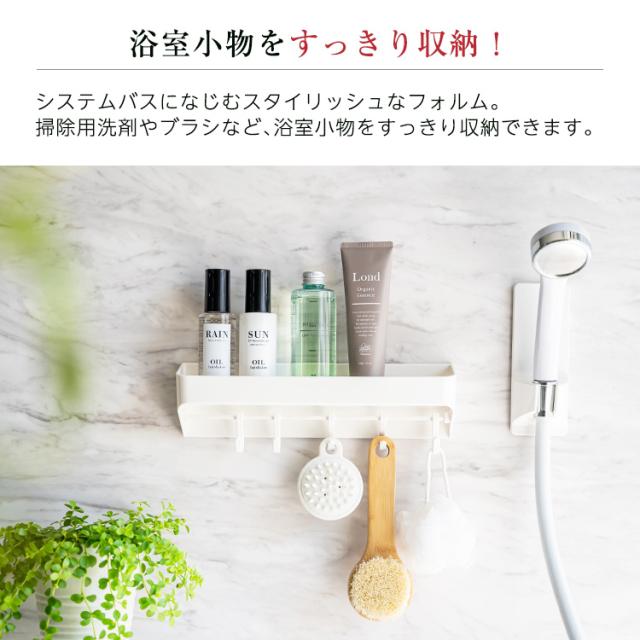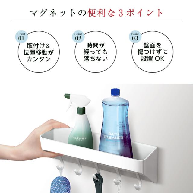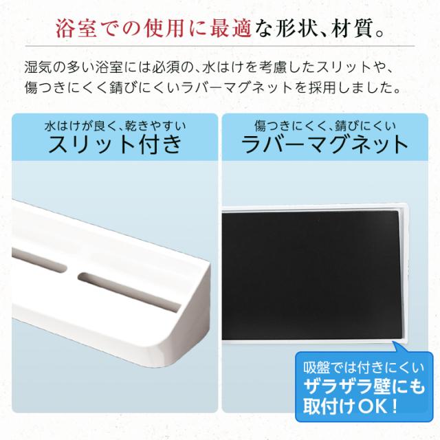 システムバスの壁面収納に最適!磁石の力でビタッとついて、浴室の壁を傷つけません。マグネットだから、使いたい場所に、取り出しやすい場所に、自由自在に取り付け、取り外しも簡単。洗顔料やシャンプー、リンスなどのチューブやボトル、洗剤など、様々なお風呂グッズをすっきり収納!水切り付きなのでお掃除も簡単。インテリア性抜群のおしゃれなラックです。耐荷重 : 2.5kg(フック1個:0.3kg)サイズ : 幅30.4×奥行6.6×高さ9.8cm材質 : 本体・フック=ABS樹脂 バー=ステンレス鋼(樹脂コーティング)/ラバーマグネット