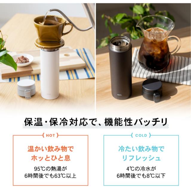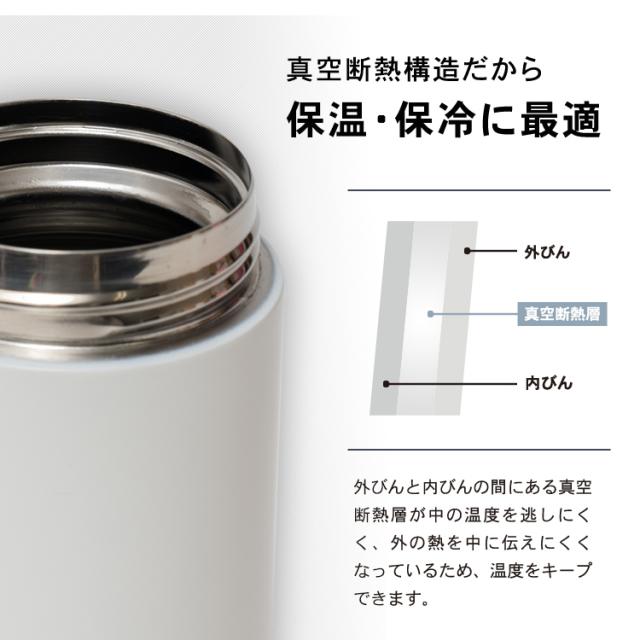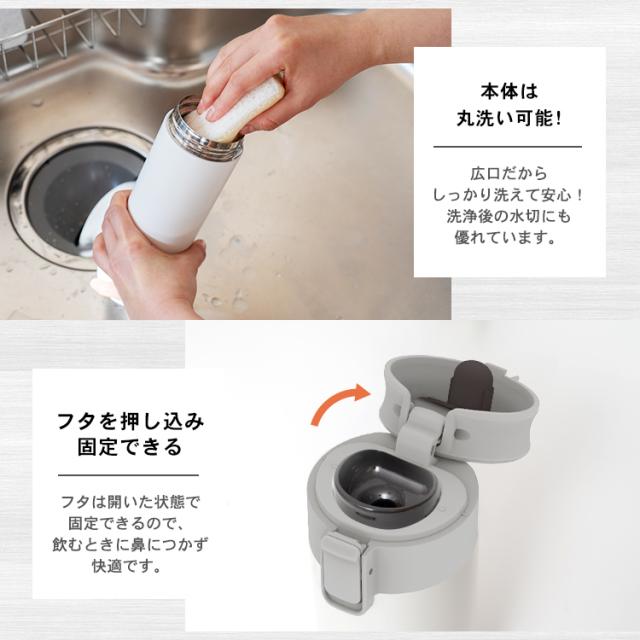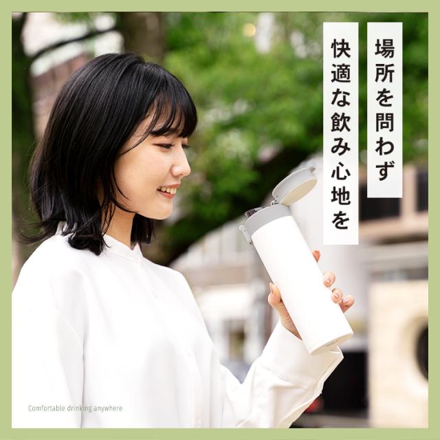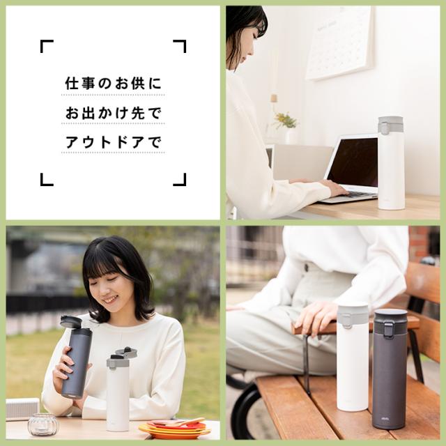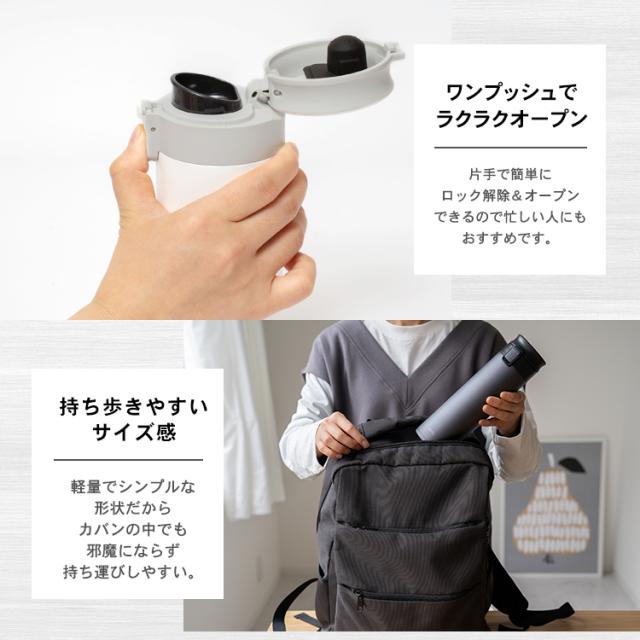 温かい珈琲や紅茶を、持ち運べる「保温マグボトル」。ステンレス真空断熱構造で、温かさが長持ち。ワンタッチオープンで、開閉も簡単、直飲みできます。パッキン一体型構造でお手入れカンタン!パッキンを紛失する心配もありません。自宅から持ち運べるから、節約にもピッタリ。たっぷり飲みたいときにぴったりの500mlサイズです。容量 : 0.5リットルサイズ : 幅6.7×奥行7.5×高さ22.6cm材質 : 本体=ステンレス鋼(アクリル樹脂塗装) フタ・フタ本体=ポリプロピレン 栓=PBT/ABS樹脂(栓部)/シリコーンゴム(パッキン部) ロックレバー=ABS樹脂 ストッパー=ポリアセタール バネ・軸=ステンレス鋼 フタパッキン=シリコンゴム