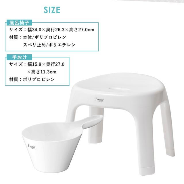 座り心地と清潔さにこだわった「エミール」。体に沿う曲線がお尻にやさしくフィットします。4本脚形状だから、通気性が良く、カビにくく、清潔さを保ちます。裏面に、余計な凹凸がないので、ふき取り掃除も簡単に。浴槽に引っ掛けて乾かす事も出来ます。床置きのボトルなども取りやすい、25cmサイズです。「手桶とのセット販売のページです」「風呂いす」イスの高さ : 25cmサイズ : 幅34.8×奥行25.7×高さ27.3cm本体:ポリプロピレン すべり止め:ポリエチレン「手桶」サイズ : 幅25.5×奥行27.2×高さ9.7cm本体:ポリプロピレン日本製