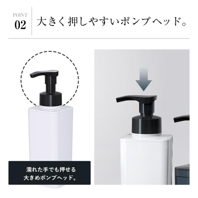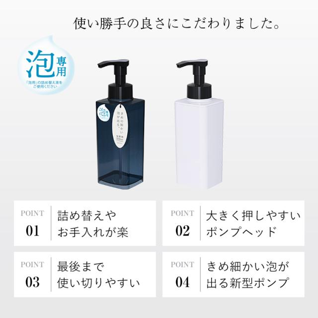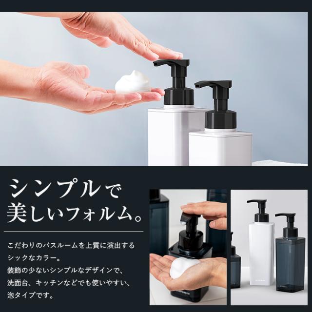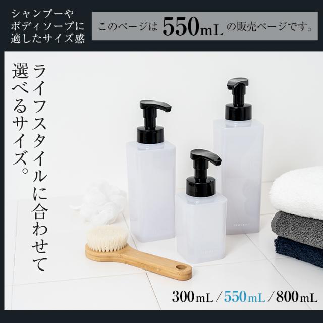 感動のふんわり泡が出せる♪シンクや水廻り、浴室をスタイリッシュに彩る詰替えボトル!シンプルなクリアボディがおしゃれです。押すだけで泡が出てくる「泡タイプ」!(※泡用の詰め替え液をご利用ください)ボディソープ詰め替えに便利な550mlサイズ・取り外せるフタで開口部が大きいので、詰め替えが簡単。お掃除のときもスポンジが底まで届きやすいので、水廻りを清潔に保てます。大型のポンプヘッドは押しやすく、快適!