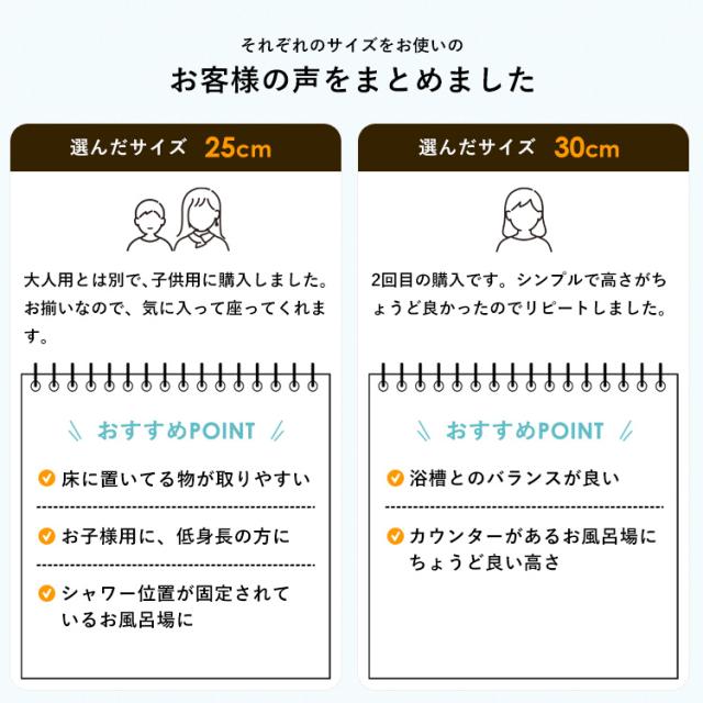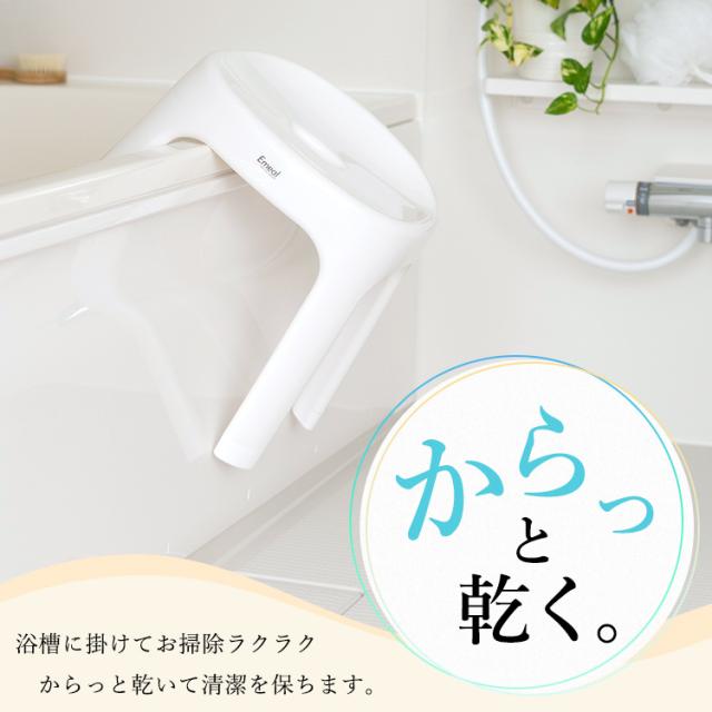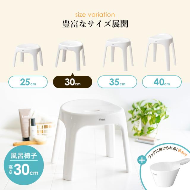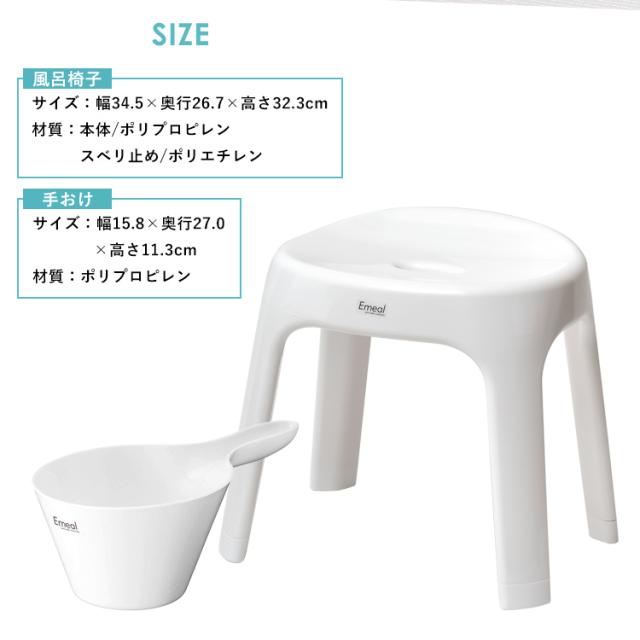 座り心地と清潔さにこだわった「エミール」。体に沿う曲線がお尻にやさしくフィットします。4本脚形状だから、通気性が良く、カビにくく、清潔さを保ちます。裏面に、余計な凹凸がないので、ふき取り掃除も簡単に。浴槽に引っ掛けて乾かす事も出来ます。バスカウンターに合わせた、30cmサイズです。「手桶とのセット販売のページです」「風呂いす」イスの高さ : 30cmサイズ : 幅34.5×奥行26.7×高さ32.3cm本体:ポリプロピレン すべり止め:ポリエチレン「手桶」サイズ : 幅25.5×奥行27.2×高さ9.7cm本体:ポリプロピレン日本製