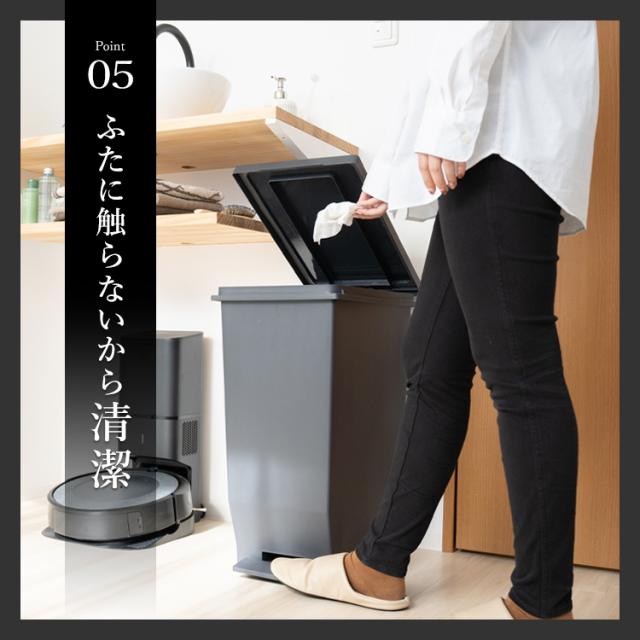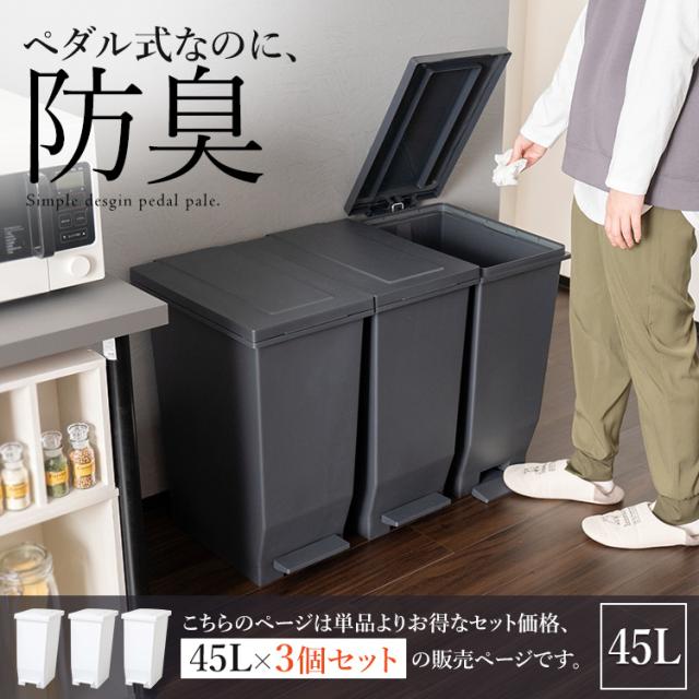 手を使わず、足で開閉できるペダルペール。臭いもれを防ぐパッキン付きで生ごみを捨てても安心。ゴミ袋をセットできる袋止め付き。たっぷり入る大容量サイズ(45リットル )のお得な3個セットです。容量 : 45リットル サイズ : 幅28.4×奥行46.2×高さ58.7cm材質 : フタ・本体・袋止め・ペダル=ポリプロピレン ペダルロッド=スチール(クロームメッキ) パッキン=ポリエチレン日本製